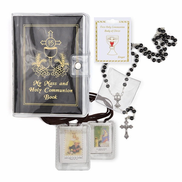 Boy's Communion Set with Black Mass Book, Cloth Scapular, Rosary, and Pin