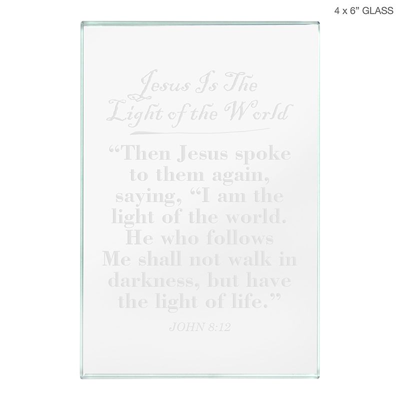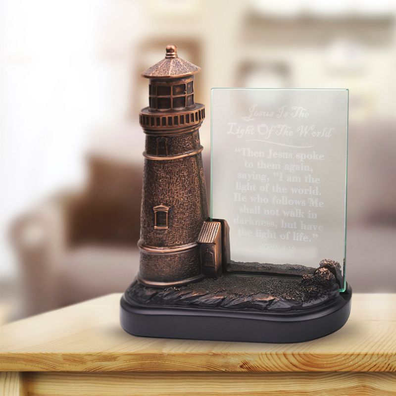 7 x 5 inch antique bronze lighthouse decorative resin statue with a 4 x 6 inch engraved glass on a dark brown base with detailing. The lighthouse features intricately carved detailing and the glass is engraved with a verse from the book of John;