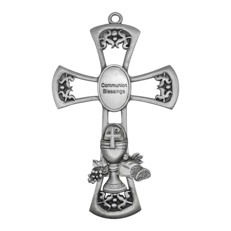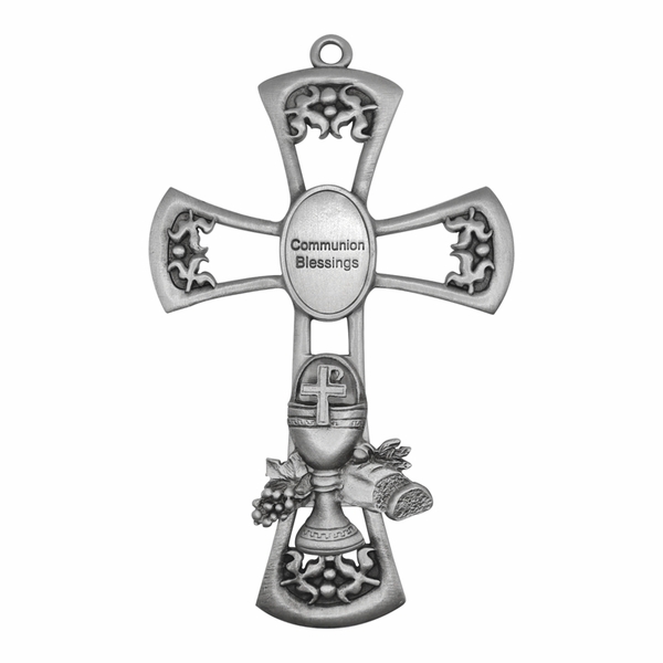 5-1/2 x 3-1/4 inch satin and antiqued finish pewter Communion Blessings wall cross. The cross features ornate detailing and has rounded edges. In the center of the cross, it reads "Communion Blessings". At the bottom of the cross is a raised image of a chalice with grapes and bread, representing the Eucharist. The Eucharist celebrates the real presence of Christ in the elements, where he is believed to be substantially present body, blood, soul, and divinity.