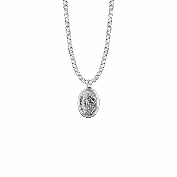 1 x 5/8 inch Satin finish silver plated St. Florian oval medal on a 20 inch stainless steel rhodium plated chain. The pendant features a raised image of Saint Florian on the front. The back of the medal reads "Pray For Us" with a floral accent. Includes a blue Singer presentation box.
