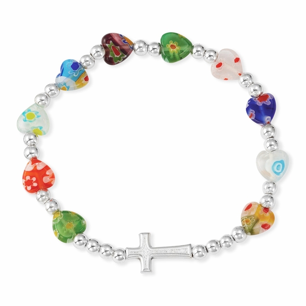 6 inch Murano glass bead rosary stretch bracelet. The beads of the bracelet are heart shaped and feature round silver beads between each heart - the heart beads represent the decades. The front of the bracelet feature a horizontal silver plated cross. Bracelet comes carded.