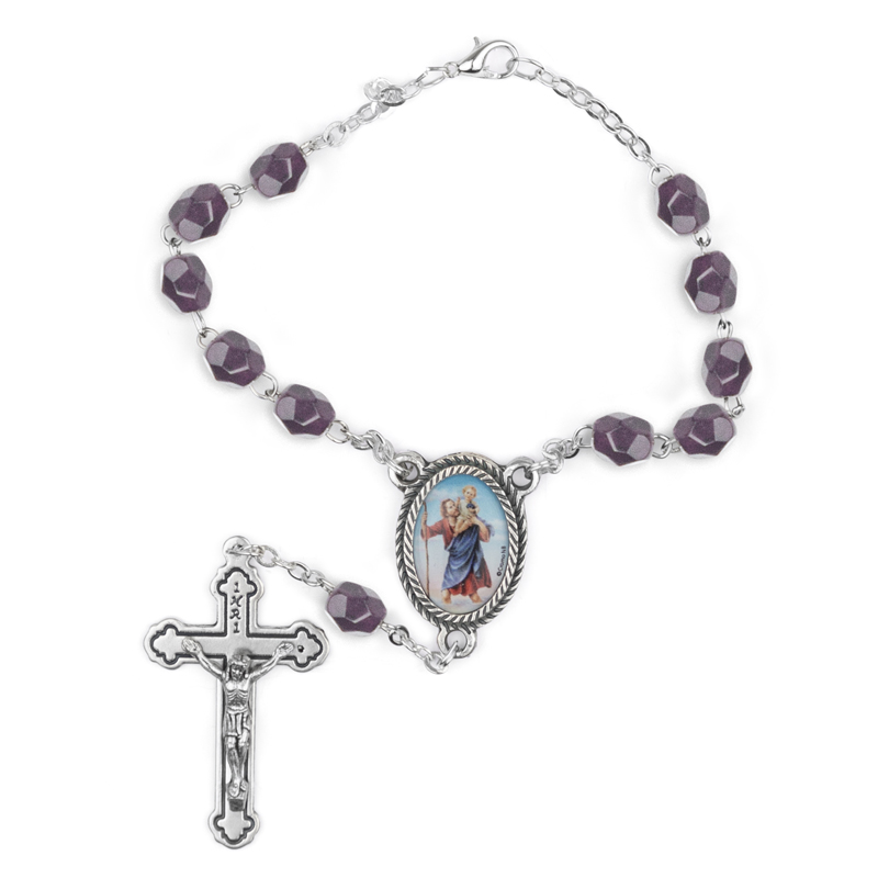 6mm Amethyst Glass Beads Auto Rosary with Crucifix and St. Christopher Center