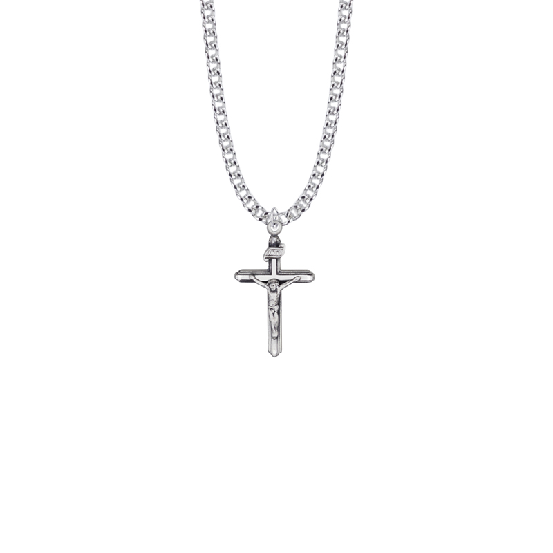 1 x 9/16 inch satin and antique finish sterling silver lined crucifix necklace on a 20 inch stainless steel rhodium plated chain. The crucifix pendant features a raised figure of Jesus Christ on the cross in front of lined detailing with antique finishing. The ends of the pendant feature delicate diamond drag engraved points.